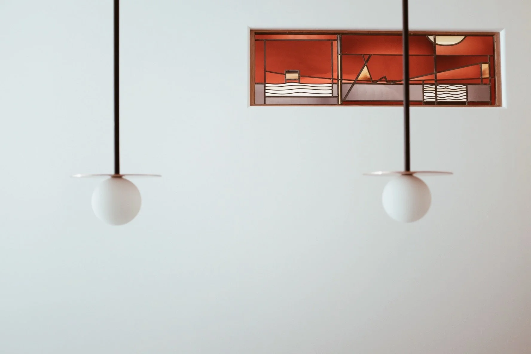 Pictured above are custom copper and powder coated matte black ceiling pendants and an original stained glass transom window we had designed for the unit by a local stained glass artist.